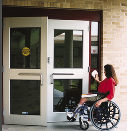 The visibility of a stainless steel handicap push button and the proper automatic door signage shows pedestrians that the entry way is automated.